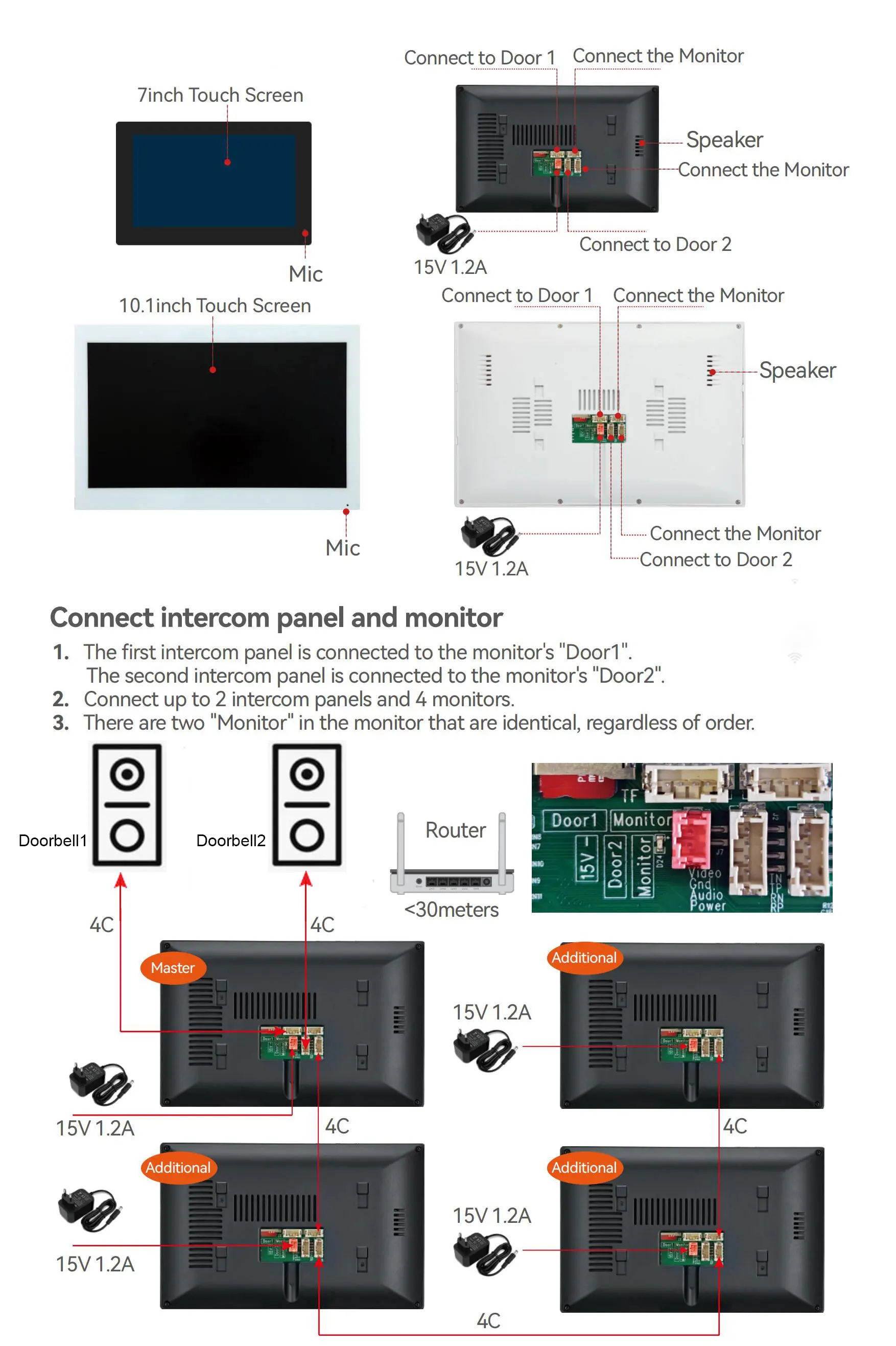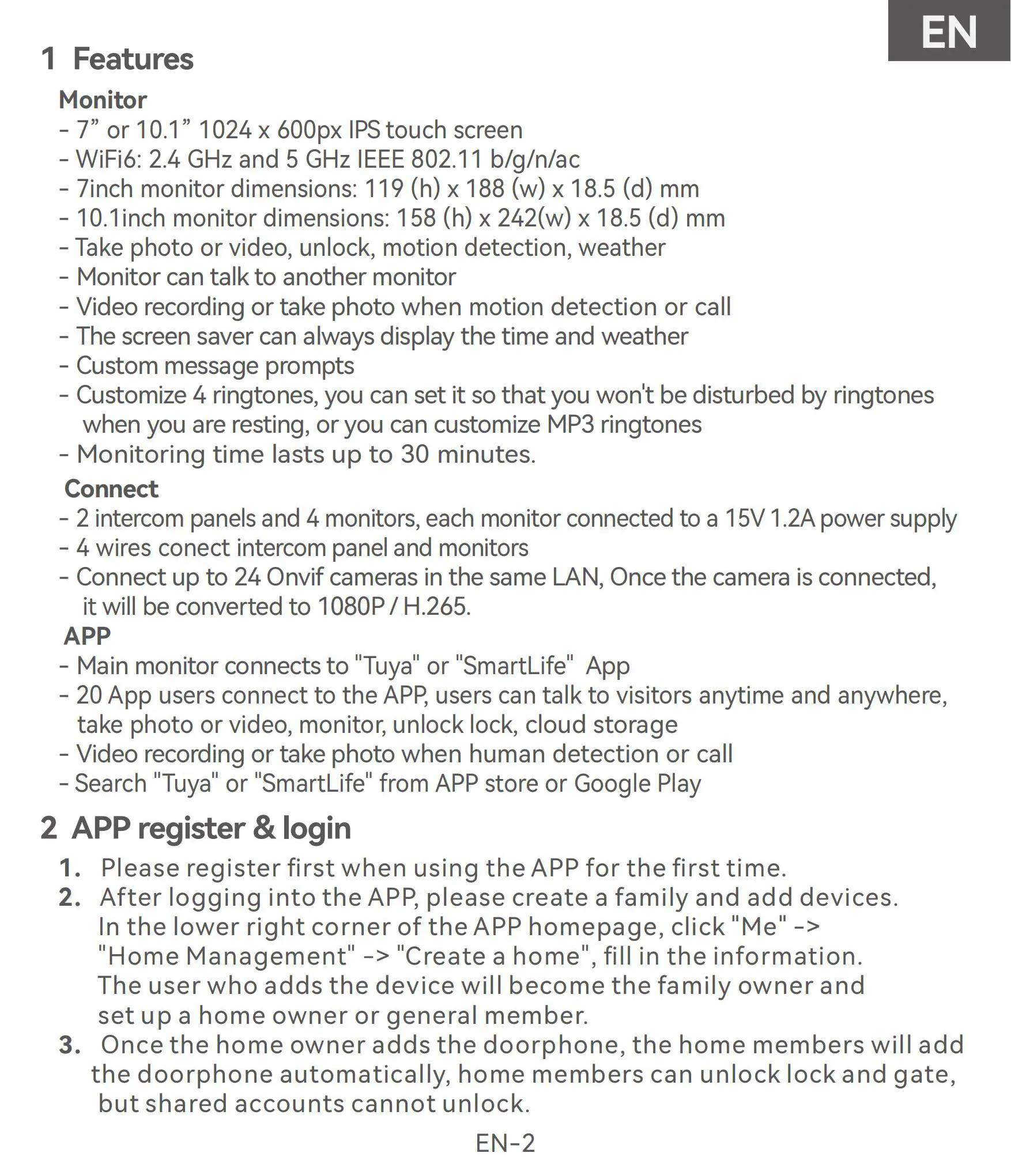 2-way communication between indoor and outdoor unit. Support 2 way communication between monitors.