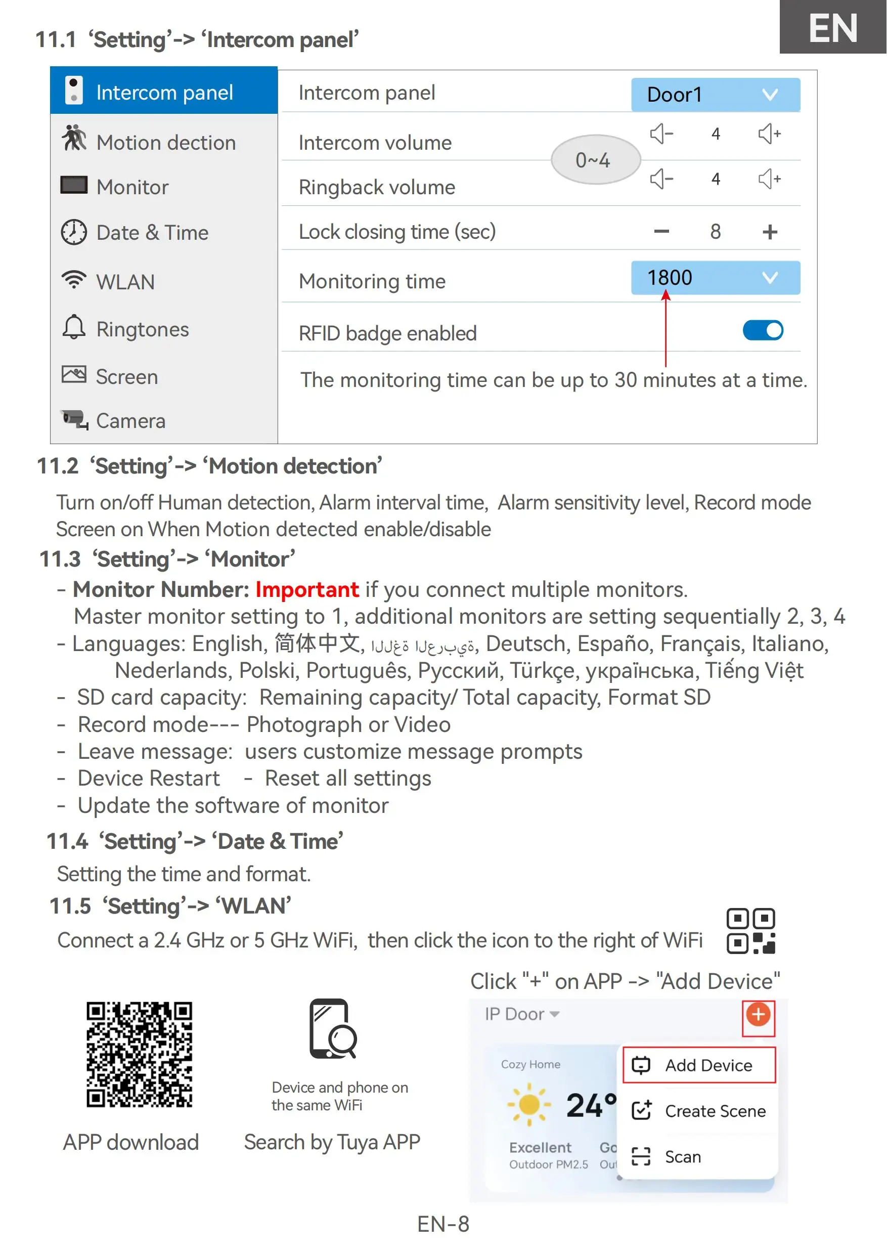 Please note the wifi video intercom system not mean it’s don’t need any cable. The monitor support WIFI network,but the indoor monitor and doorbell is Wired connect.
