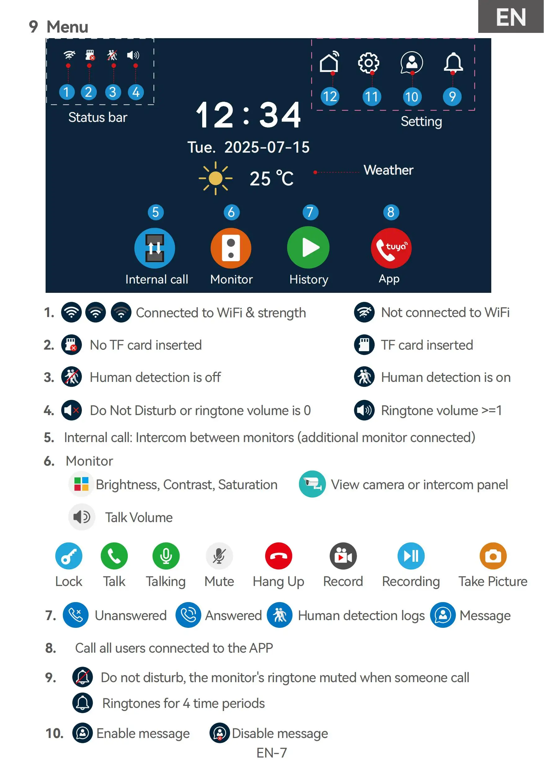 Support iOS & Android smart phone with Tuya Smart APP, When somebody call at outdoor, your monitor and smartphone will ring at the same time.